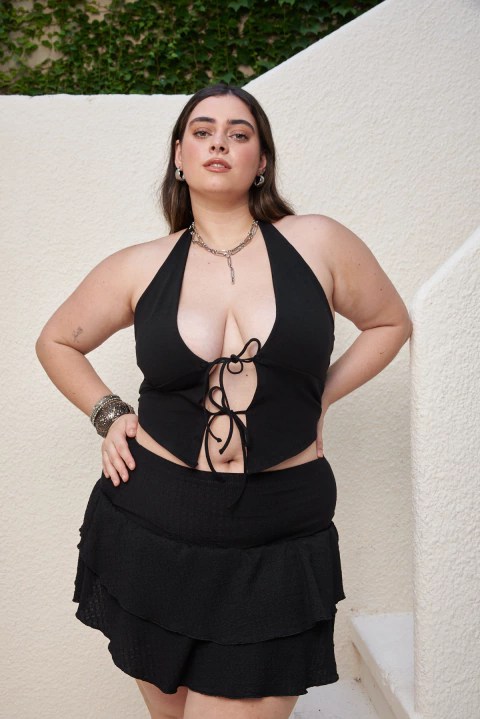 Top con escote profundo en V y cierre frontal mediante lazos regulables que permiten ajustar el calce y sumar un detalle sexy y moderno. Su diseño corto realza la silueta y lo convierte en una prenda ideal para looks nocturnos o outfits urbanos con actitud.